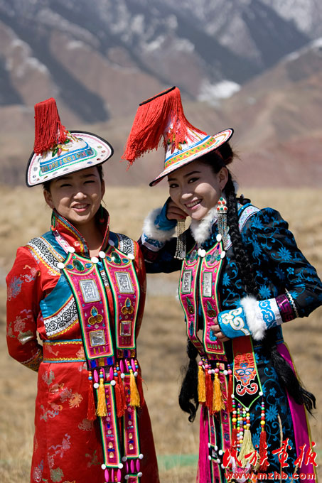 帽子是姑娘和已婚婦女的區(qū)別標(biāo)志。姑娘不戴帽子,前額戴“沙日達(dá)什戈”。這是一條寬約三寸長(zhǎng)約一尺,下邊緣用紅色或白色珊瑚小珠穿縫許多珠穗的紅色布帶。已婚婦女身穿高領(lǐng)偏襟長(zhǎng)袍,一般由綢、緞、布、褐、皮料縫制。衣領(lǐng)高齊耳根,袍子一般以綠、藍(lán)色為主,但也有深紅、紫紅等顏色。袍子下擺兩邊開衩,衣袖口至肘部用各色織錦緞、彩綢、彩緞花邊一圈圈縫綴裝飾。腰系腰帶(裕固族也叫“胡兒”,即系腰),主要是桃紅色或綠色,長(zhǎng)袍上面罩一件高領(lǐng)偏襟坎肩,但也有無領(lǐng)偏襟坎肩。