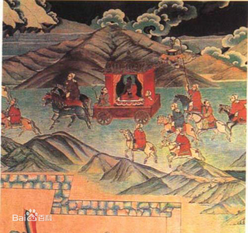 貞觀15年(641)正月十五,唐太宗將文成公主下嫁松贊干布,詔令江夏王李道宗持節(jié)護(hù)送。文成公主在唐送親使江夏王太宗族弟李道宗和吐蕃迎親專使祿東贊的伴隨下,前往吐蕃。文成公主一行從長安出發(fā),途經(jīng)西寧,翻日月山,長途跋涉到達(dá)拉薩。 松贊干布率群臣到河源附近的柏海(今青海瑪多縣境內(nèi))迎接文成公主,謁見李道宗,行子婿之禮。之后與公主同返邏些(今拉薩),為公主筑城、修建宮室。
