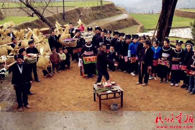 苗族送親隊伍來到新郎家的寨口,寨老為新娘主持“回喜神”儀式。楊昌垠,引自民族畫報