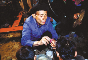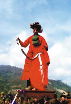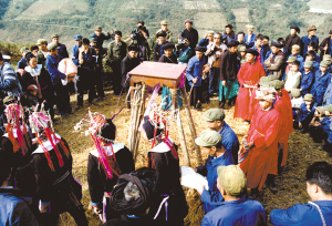 受戒儀式前前后后要舉行好幾天,一般依照受戒者家的經(jīng)濟條件來定。時間短的叫“小辦”,時間長的稱“大辦”。但其中有一條,不論時間長短,度戒中的規(guī)矩是不能違背的。這次十幾位受戒者合起來辦的度戒,聽說是七天七夜的“大辦”。在這幾天中,受戒者必須嚴禁會客、社交、唱歌等,只能低頭修身養(yǎng)性,吃清淡無油的飯和水。度戒中最重要的一件事是聘請師父,有“度師”和“度道”之分,師傅自然有“師公”和“道公” 之分。師宗縣藍靛瑤中的度師為武戒,師公要負責“五臺” 受戒儀式。度道為文戒,道公身穿紅色法衣,負責念經(jīng)求神等儀式。受戒祭師一般由德高望重的長者擔任,他們是寨中一切主要事務的決策者,也是寨中最有學問的人。在受戒儀式中,他們要對弟子進行族史、族規(guī)、社會道德等多方面的教育。