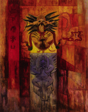 我以前所結(jié)識的一批納西族畫家差不多都是上世紀四五十年代出生的,他們大多接受過美院等高等藝術(shù)院校的教育,具有堅實的繪畫功力,有相同的美學(xué)見解和共同的探索形成的藝術(shù)追求。它一出現(xiàn)就以其獨特的美學(xué)傾向和特殊的藝術(shù)魅力引起世人的關(guān)注。而和向東是上世紀70年代出生的青年畫家,他原來就讀于浙江大學(xué)的藝術(shù)設(shè)計專業(yè),只因迷上美術(shù)學(xué)理論而走上了創(chuàng)作之路,沒有學(xué)院派的背景。他的家鄉(xiāng)云南麗江現(xiàn)在已是聲名鵲起,納西族東巴文化作為世界記憶遺產(chǎn)已聞名海內(nèi)外。作為年輕一代的納西族畫家又該怎么表現(xiàn)東巴文化呢?這個學(xué)藝術(shù)設(shè)計的年輕人以設(shè)計師的獨特眼光和思維,一開始就與“現(xiàn)代東巴繪畫派”的中年畫家群體拉開了距離。其作品在保留古老的東巴繪畫藝術(shù)的基礎(chǔ)上,在作品中運用書寫東巴經(jīng)卷的各種形象和文字符號。用當代人的思維觀念和審美意識,運用油畫的技法來表達。畫面大多用平面設(shè)計的構(gòu)成原理,以裝飾性的、形式感極強的、既寫實又抽象的手法表現(xiàn)出原汁原味的納西文化。即使拋開作品主題內(nèi)涵,依然可以從他的作品里感受到一種神秘、古樸、深沉的歷史基調(diào)。因4年前他的創(chuàng)作是在平面設(shè)計為主的業(yè)余時間里完成的,而真正投入精力進行專業(yè)創(chuàng)作是近兩年的事,因此,他現(xiàn)在處于學(xué)習(xí)、吸收、探索創(chuàng)作的過程中。