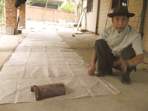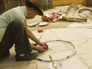 言談間,巖妞把制好的竹環(huán)放入早已畫(huà)好的同心圓圖案中的小圓上,只見(jiàn)竹環(huán)大小正好與小圓吻合。巖妞說(shuō),圖案外側(cè)的大圓便是擺放棉紙用的。接著,他把手中厚厚的幾張棉紙圍繞著已經(jīng)放入圖案中的竹環(huán)依次擺入,直至擺滿。在同心圓圖案的上側(cè),巖妞還畫(huà)了一個(gè)寬與同心圓圖案的直徑相符的矩形圖案,把棉紙鋪滿其中。巖妞說(shuō),這圖形就是“貢菲”的高度。制作的最后一道程序,是把棉紙用漿糊粘合起來(lái)。陰干后,一個(gè)“貢菲”就做好了。