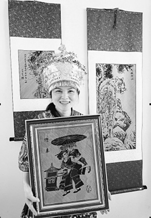 一幅幅人物肖像、書(shū)法作品、風(fēng)景風(fēng)情畫(huà),工藝精細(xì),造型典雅,誰(shuí)能想到,它們出自一群苗家留守婦女之手?