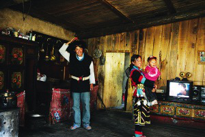 在珞巴族家中,男主外,女主內(nèi),分工相當(dāng)明確。當(dāng)達(dá)瓦在家里和我聊天時(shí),他的妻子群宗一直在忙碌著,忙著給我打酥油茶,忙著生火燒水、煮土豆,忙著照顧孩子。為了讓我能拍一張達(dá)瓦一家人穿珞巴族服裝的照片,大家費(fèi)了好大勁兒。他們從東家借來帽子,從西家找來褂子,也有從南家借來的飾品……終于,達(dá)瓦和群宗夫妻倆都穿戴上了本民族的服飾,我如愿以償?shù)亟o他們拍了一張全家福。