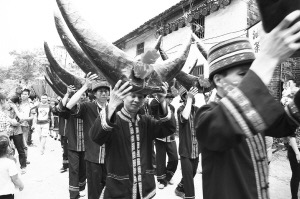 據(jù)悉,有300多年歷史的楊溪古村現(xiàn)居住著200余戶共900余名村民,該村保存完整的嶺南特色古民居有28座200余間,是恭城縣境內(nèi)保存較為完好的古建筑群之一。圖為祭牛王大典活動現(xiàn)場。
