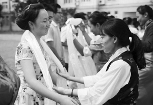 藏族學生向來自浙江的支教老師表達祝福。 王麗煒攝