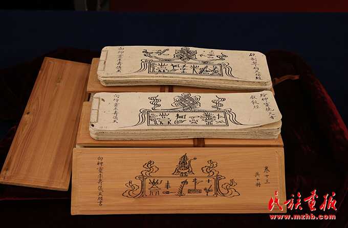 捐贈(zèng)的部分東巴經(jīng)手抄本,經(jīng)書(shū)由納西族地區(qū)的35名東巴歷時(shí)29個(gè)月完成。經(jīng)書(shū)的卷名、題名及經(jīng)文提要漢文部分由納西族書(shū)法家許烈雄書(shū)寫(xiě),封面夾板的東巴文部分由納西族新一代東巴木琛書(shū)寫(xiě)