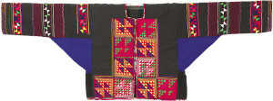 再來看這件藏品:彝族五彩棉拼布對(duì)襟女上衣。第一眼吸引人的,應(yīng)該是那鮮艷的色彩和可愛的小三角,鮮艷、喜慶、熱鬧,它幾乎符合人們對(duì)于少數(shù)民族服飾的一切想象。仔細(xì)觀察、品讀后,可發(fā)現(xiàn)這件上衣細(xì)節(jié)的妙趣之處:第一,雖然衣身的色彩鮮艷,可所有顏色都被制作者按對(duì)比色的關(guān)系排列著——紅與綠、藍(lán)與黃、黑與白,呈現(xiàn)出活潑跳躍、多而不亂的效果。第二,服裝上所有的圖形元素,不是用三角形組合成方形,就是方形中套著三角形——腋下兩塊藍(lán)色的三角結(jié)構(gòu)是由方形對(duì)折而來;領(lǐng)口也沒有裁成常規(guī)的圓領(lǐng),而是做成了與衣身拼布相呼應(yīng)的方形。如此一來,各種零碎的裝飾元素被牢牢地統(tǒng)一的方形框架中,顯得協(xié)調(diào)有序,又不失細(xì)節(jié)趣味。