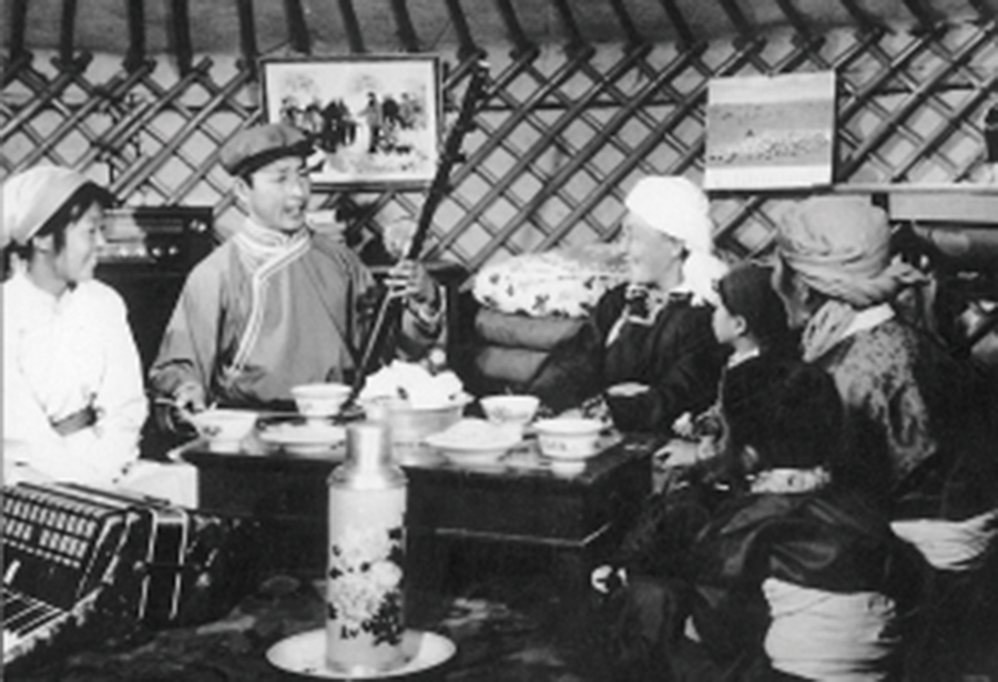 烏蘭牧騎的全國巡演,源于1964年底的全國少數(shù)民族群眾業(yè)余文藝觀摩匯演。當(dāng)時內(nèi)蒙古自治區(qū)文化局從全區(qū)各旗縣抽調(diào)15名藝術(shù)骨干,組成烏蘭牧騎代表隊(duì),進(jìn)京匯報演出。進(jìn)京匯演以蒙古族傳統(tǒng)歌舞形式為主,如蒙古族說書“好來寶”、馬頭琴獨(dú)奏、安代舞、頂碗舞等。這些歌舞、說唱無論在過去還是現(xiàn)在,都是蒙古族音樂藝術(shù)的典型代表。但就這些藝術(shù)形式所表現(xiàn)的具體內(nèi)容而言,則以反映當(dāng)時社會政治文化生活主題的作品占絕大多數(shù),如《巡邏之夜》、《為祖國鍛煉》、《達(dá)西是個好戰(zhàn)士》、《唱支山歌給黨聽》、《紅旗一代傳一代》等。進(jìn)京之后烏蘭牧騎演員受到國家領(lǐng)導(dǎo)人的接見,并由周恩來總理提議向全國推廣。短小精悍的藝術(shù)表演形式,濃郁的民族風(fēng)情,使其成為傳播民族政策和促進(jìn)民族團(tuán)結(jié)的有力工具。