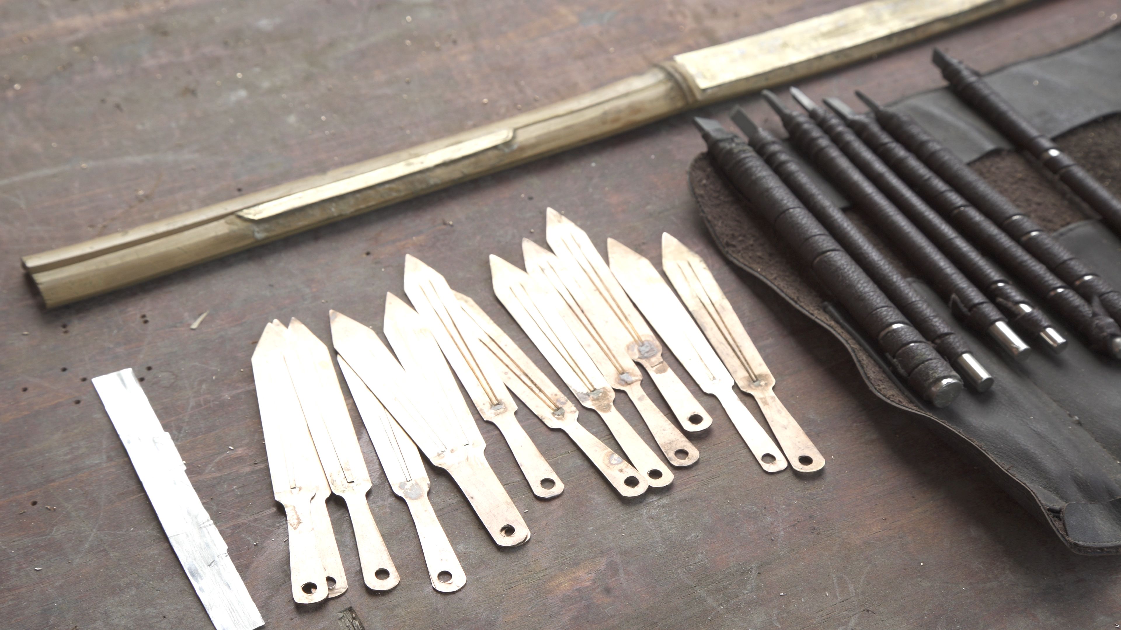 圖片名稱:貴州貴陽清鎮(zhèn)市流長鄉(xiāng)腰巖村苗族制作口弦所需材料和工具-銅黃片、竹子、小刀、鑿子