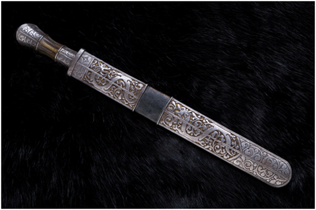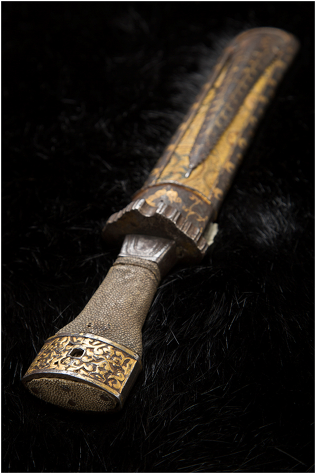 戰(zhàn)刀,鐵柄,銅浮雕刀鞘,明代