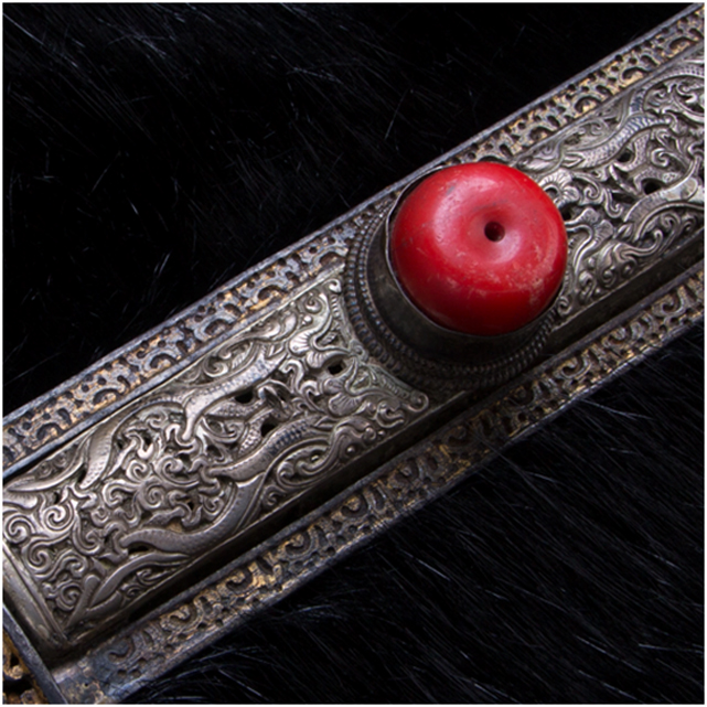 康區(qū)人性格粗獷豪放,刀對于他們來說,主要是戰(zhàn)斗的武器,他們愛刀勝過愛牛羊,一把好刀就是一筆財富,其形象也會因之而無形中高大起來。正因為如此,他們不僅對刀本身有較高的要求,對其作為襯托武士氣概的刀的外在形制也有特殊的喜好。刀鞘材料一般使用黃、白銅或純銀,鑲珠嵌寶,正面雕龍畫鳳,背面線刻卷草,佩在身上,起到了美觀和威懾的雙重作用。