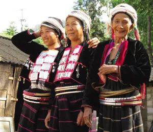 直到今天,腰箍仍在德昂族服飾中占有重要位置。按德昂人的習(xí)慣,姑娘成年后,就要在腰部佩上若干腰箍。這些腰箍大多用藤篾編成,藤圈寬窄粗細不一,有的漆成紅、黑、綠等色;有的刻上花紋,包上銀皮、鋁皮;還有的一半是藤篾,一半是銀絲。姑娘們以腰箍多、腰箍美為榮。因此,在戀愛期間,小伙子為了討姑娘歡心,往往費盡心機地制作精巧的腰箍相贈。腰箍從傳說的用來“拴住人”,演變成為用來“拴住心”。