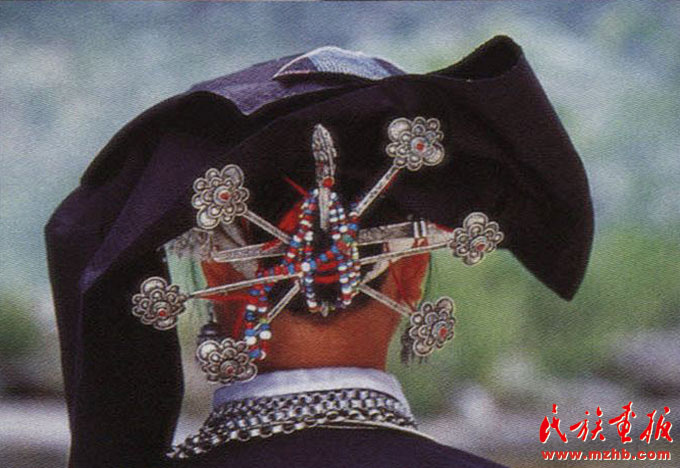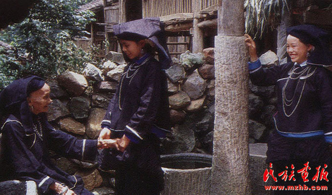 婦女的服飾更具特點(diǎn),無論老少,都喜歡穿右蓋大襟和葫蘆狀矮腳圓領(lǐng)的緊身短式上衣,下身以寬褲腳、大褲頭的褲子相搭配,腰系黑布做成的大圍裙,頭帶黑布大頭巾。其圍裙既寬且長,戴時(shí)能系周身有余,裙底垂掛到小腿下部,圍裙不僅作為裝飾,而且可以作為勞動(dòng)工具,遇趕圩或走親訪友和勞動(dòng)時(shí),可將圍裙底翻卷上來作成小包袱,用以包裝和盛裝物品。婦女頭巾都是一塊自己紡織染成的長條黑布,戴時(shí)先圍繞在頭上,然后翻折擺布成火棱形的圖樣,罩在整個(gè)頭上,再把頭巾的兩端分別垂掛到雙肩上,看上去樸素美觀。同時(shí)還可以當(dāng)做帽子遮蔭用。她們的衣邊、衣角、袖口、裙邊和頭巾的四邊都用紅布或黃布剪成小條以后鑲捆上去,有的則用紅、黃、藍(lán)色絲線繡成波浪形的線條,使黑中襯出紅、黃、藍(lán)色的線條來,清雅明亮,色彩協(xié)調(diào)。再加上頭發(fā)插著龍頭形的銀簪,頸項(xiàng)上帶有銀鏈或項(xiàng)圈,手帶銀圈、玉鐲,耳掛珍珠耳環(huán)等,使人一看,黑中閃艷,樸素之中亦有玲瓏之美,表現(xiàn)了她們獨(dú)特的審美觀。