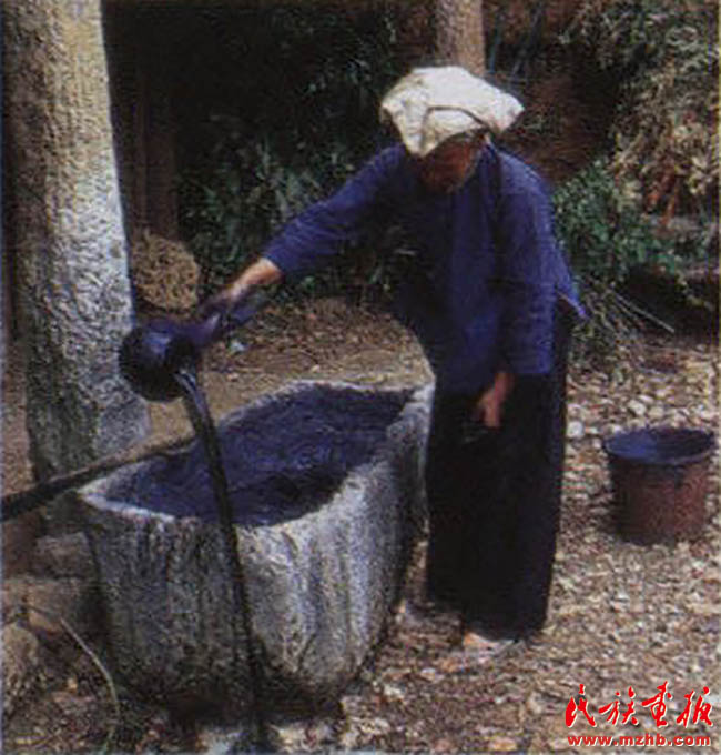 制作藍(lán)靛是一件普通卻又很神圣的事情,藍(lán)靛里蘊(yùn)藏著黑衣壯崇拜的黑色