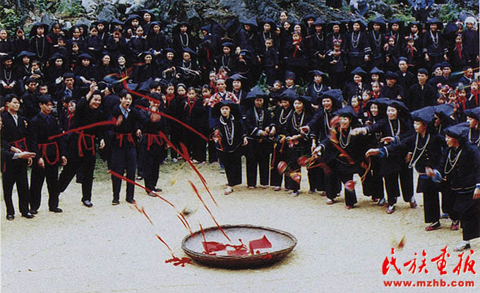 黑衣壯青年男女的戀愛熱情浪漫,一個(gè)個(gè)扔向簸箕的香包和紅帶子,不久就會(huì)連接兩顆年輕的心,引出一段醉心動(dòng)人的愛情故事
