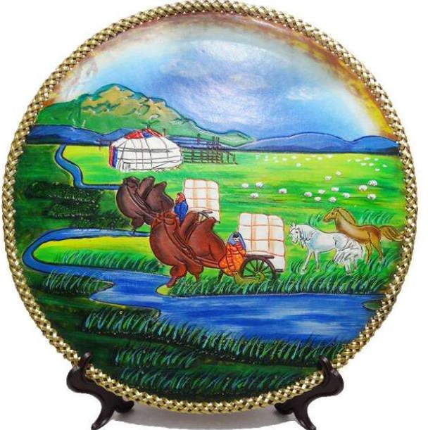 蒙古皮畫,精選草原天然優(yōu)質(zhì)牛皮經(jīng)過(guò)特殊描繪、著色、層染、拋掐光、定形,半浮雕凹凸壓制等一系列工藝、幾十道工序,純手工制做完成。充分利用和展示了天然皮革所具有的皮質(zhì)皮色,具有線條流暢,構(gòu)描圖別致,立體感強(qiáng),色彩柔和等特點(diǎn),給人以全新的藝術(shù)享受。
