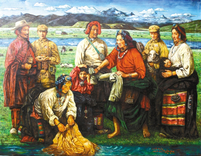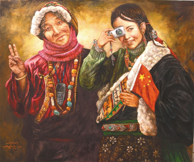 “以前畫畫時,對自己的最高要求就是畫得要逼真,把油畫畫得像一幅放大了的照片,而現(xiàn)在關注的是如何畫出能體現(xiàn)當代的畫面。西藏的美是無窮無盡的,我就想用繪畫的方式窮盡一生去追求,展現(xiàn)大美西藏?!比缃竦乃髀幔チ顺醭雒]時一味追求畫面質感的匠氣,多了些許內(nèi)心對西藏這片熱土深層次的思考。他筆下的西藏是一片充滿生機的土地,濃墨重彩之間,既有對傳統(tǒng)和過往年華的回望和懷念,又在仿若不經(jīng)意間透過一個眼神、一抹色彩、一個小物件盡情詮釋活力和希望。