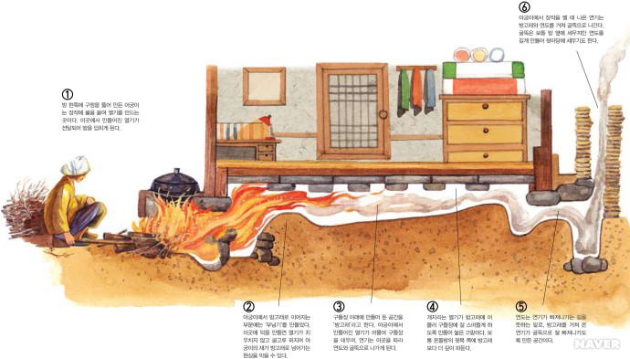 在傳統(tǒng)的朝鮮族民宅中,炕和鍋臺是平齊的,需要燒火做飯時,主婦會打開架在柜臺一側(cè)的移動木板,下到地面水平線以下的“灶坑”點火做飯。傳統(tǒng)的炕采用長筒式結(jié)構(gòu),煙火由一洞內(nèi)循環(huán)排出,使每洞都有煙火串入,炕即溫熱。朝鮮族的火坑高度為30-40厘米,但炕洞向下挖入,炕面抹白灰,表面糊油紙或鋪草簾子,炕面平整。隨著物質(zhì)條件的改善,炕面改鋪纖維板或者地板膠,既美觀又耐用。