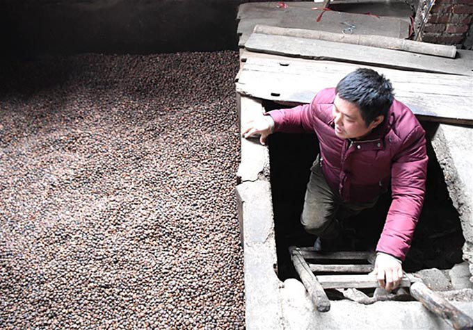 在廣西桂林市龍勝各族自治縣泗水鄉(xiāng)龍甸村里排壯寨,侯光祖幫爺爺侯正榮查看茶籽烘烤情況(新華社記者周華 攝影)