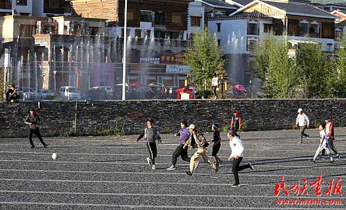 災(zāi)后重建讓玉樹大踏步前進(jìn),人們悠閑地走在廣場(chǎng)上享受著基礎(chǔ)設(shè)施改善帶來的各種便利