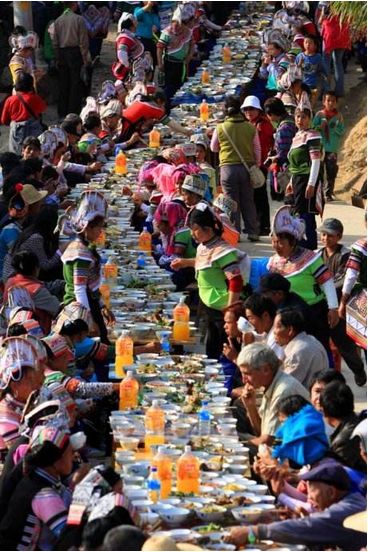 節(jié)日期間,哈尼寨子擺起長街宴,哈尼語叫“姿八多”,意為“互相輪流著敬酒”。小寨子擺一次,吃一天,大寨子則要擺兩三次,吃兩三天。每戶做一桌酒菜,抬到寨子街道上擺好,一戶接一戶沿著街道擺成長街宴,八個或十個人自愿結(jié)合為一桌暢飲。大寨子分片輪流做東,負責長街宴的酒菜,其他片的人做食客,從早吃到晚,場面十分熱鬧。