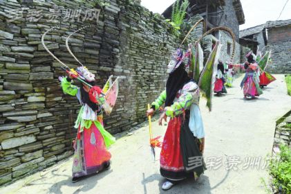 安順地戲的顯著特點(diǎn)是演出者頭蒙青巾,腰圍戰(zhàn)裙,戴假面于額前,手執(zhí)戈矛刀戟之屬,隨口而唱,應(yīng)聲而舞。