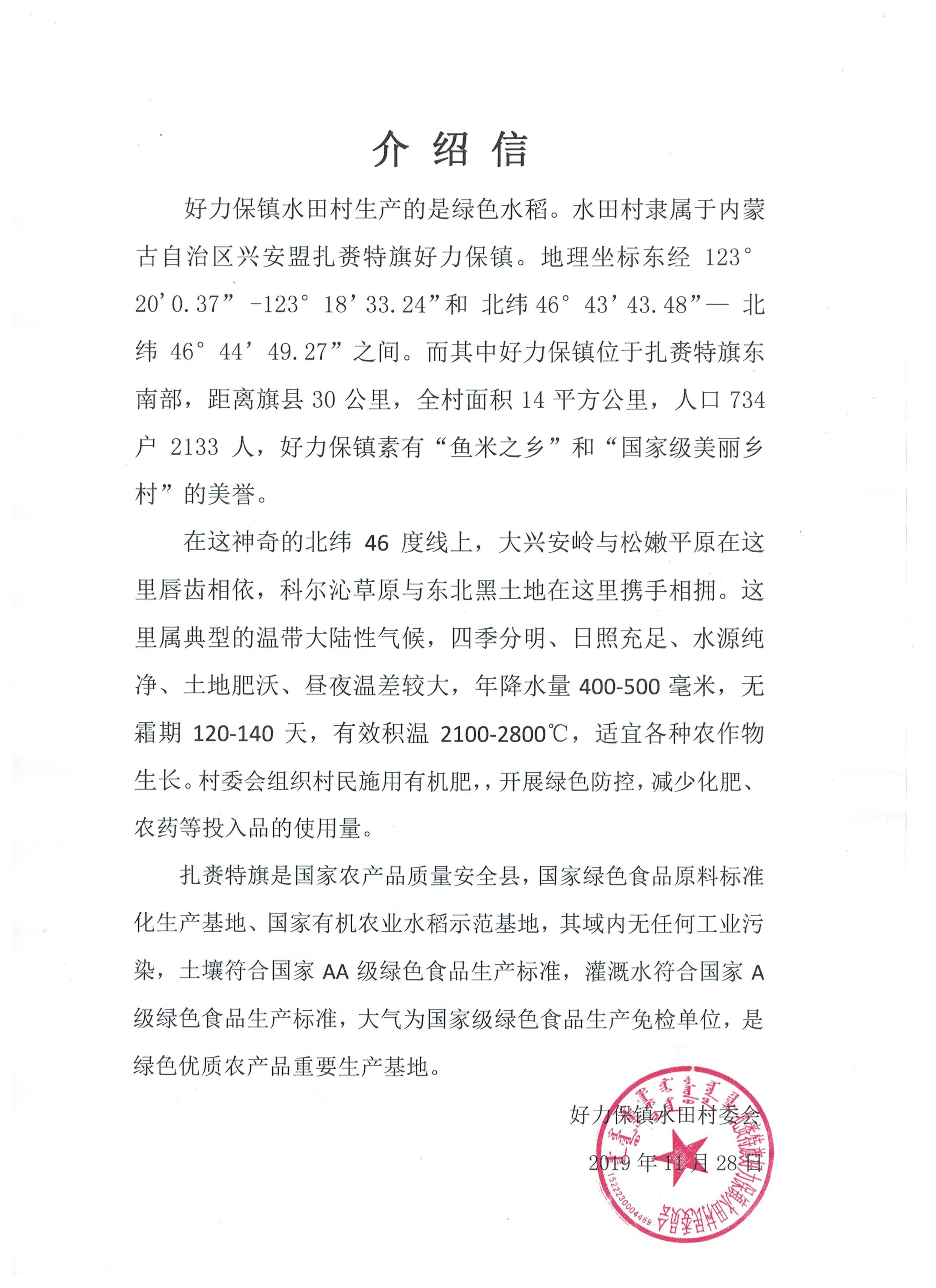 蒙古屯村屬好力保鎮(zhèn),沿綽爾河岸而建,水田較多,祖輩種植水稻。蒙古屯村的土壤以黑土為主、土質(zhì)肥沃,全年積溫在2600到2700攝氏度左右、并且早晚溫差較大,有利于水稻中有機(jī)物的積累。綽爾河水充足時,可以滿足沿岸灌溉需求;河水流量較少時,蒙古屯村自有的機(jī)井也可以滿足種植所需的水量。