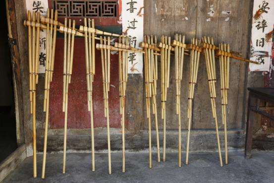 他想去想來,在家后面有一片竹林,他就用竹子一管一節(jié),用綿條做成簧片,裝在竹管里面吹發(fā)出聲音,每一根竹管發(fā)出的聲音都不同。他就發(fā)給這些兄弟每人一截,二兄弟比老三的長一點(diǎn),老三比老四的長一點(diǎn),老四比老五的長,老六就是最短的。大家晚上回來,大哥就說,你們干活真的挺賣力,每天都不知道怎么請你們吃飯,所以我想了一個辦法,以后每天聽到我發(fā)出的聲音,說明我已經(jīng)做好飯可以吃了,你們就回來互相打信號。大家都說,大哥是一個聰明人,這個辦法很好。