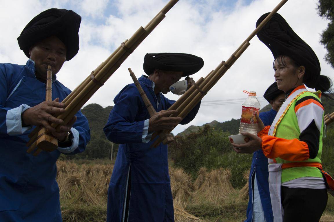 就這樣年復(fù)一年的干活,后來因?yàn)榇蠹夷挲g大了,干活賣力糧食也豐收了。大哥就想,現(xiàn)在能吃飽了,要讓大家有個玩的地方和玩的工具。想去想來,他用家里面的葫蘆,把笙管插進(jìn)去,一吹又是有一種味道。所以大哥就把竹管插進(jìn)葫蘆里面,把聲音通過仔細(xì)調(diào)音制出了蘆笙,六個聲音當(dāng)時叫做六笙,后來才叫做蘆笙。