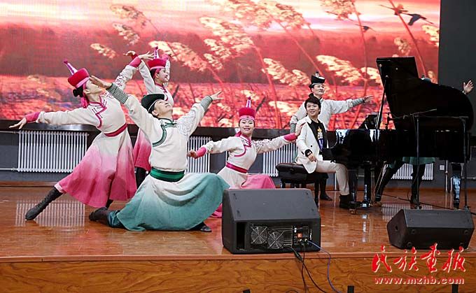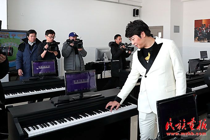 在“快樂的琴鍵”音樂教室捐贈儀式上,朗朗與內(nèi)蒙古藝術劇院直屬烏蘭牧騎演員聯(lián)合表演了《鴻雁》。