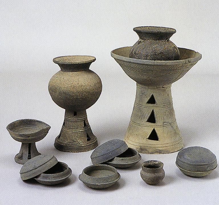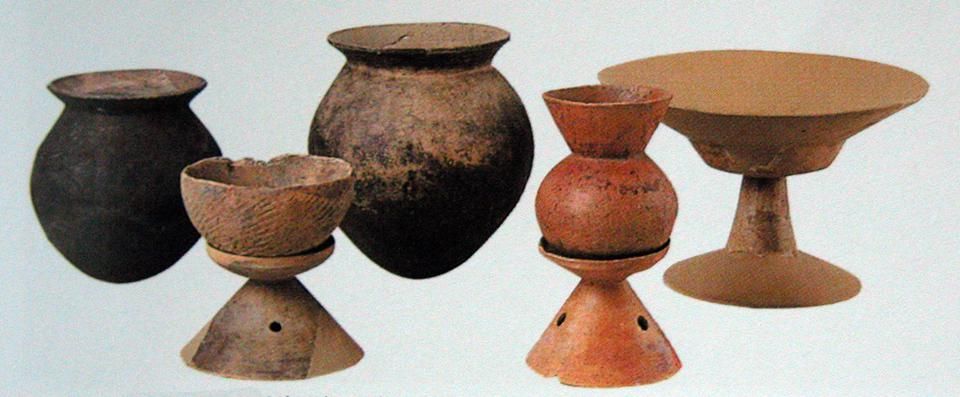 彌生時代的名稱,源自1884年東京市本鄉(xiāng)彌生町“彌生陶器”的發(fā)現。彌生陶器與繩紋陶器截然不同,為素面,灰色。日本人認為彌生陶器是“渡來人”制造的?!岸蓙砣恕笔侵袊箨懲ㄟ^朝鮮半島而來,他們帶來了陶器的制作技術。彌生陶器為深釜器,以甕形器、缽形器、高腳杯(豆形器)為主(圖五)。