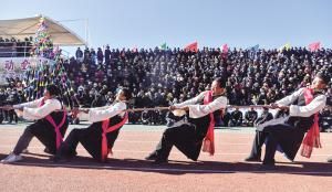2020年11月29日,為期三天的西藏自治區(qū)山南市扎囊縣首屆農(nóng)民運動會在扎囊縣體育公園進(jìn)行。抱石頭、套麻袋、氆氌纏線等多項趣味十足的運動,吸引了來自扎囊縣5個鄉(xiāng)(鎮(zhèn))、62個行政村(居)的450多名農(nóng)牧民運動員參加角逐。每年冬季,雅魯藏布江流域的西藏農(nóng)村進(jìn)入農(nóng)閑時期,當(dāng)?shù)剞r(nóng)牧民就迎來了一年中難得的休閑時光。圖為農(nóng)牧民運動員在進(jìn)行拔河比賽。