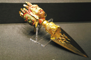 持驗(yàn)法器單元主要展示修持佛法、舉行佛事活動(dòng)和佛教儀式時(shí)所用的法器,包括金剛鈴、金剛杵、嘎巴拉碗、嘎巴拉鼓、嘎巴拉念珠、喀章嘎、金剛橛、鉞刀等。本部分所選法器多為藏傳佛教密宗修行所用,因多存于庫房,已不在原佛堂陳設(shè),其用途和使用場所便難以知悉。故宮中有許多佛堂,大多是乾隆時(shí)期建造,其中很多是密宗佛堂,如雨花閣、梵華樓、梵宗樓、養(yǎng)心殿西暖閣佛堂等。
