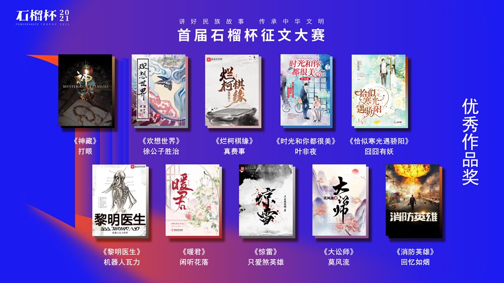 6月19日,民族題材網絡文學創(chuàng)作論壇暨首屆石榴杯征文大賽頒獎典禮在京舉行。作為國家民委主辦的“中華民族全家?!毕盗谢顒又唬讓檬癖魑拇筚惖玫搅藝颐裎幕麄魉竞椭袊贁?shù)民族文化藝術促進會的指導與支持,由閱文集團聯(lián)合天成嘉華文化傳媒、中國民族文化資源庫、中國民族文化資源網共同舉辦。本屆大賽以“講好民族故事 ,傳承中華文明”為主題,涌現(xiàn)出眾多弘揚民族精神、表達文化自信、傳播正能量的作品。經過專家推薦及嚴格評審,《草原有座蒙古包》、《走西口之天山行》、《彩云微光》等三部作品獲“最具民族風采獎”,《神藏》、《歡想世界》、《爛柯棋緣》、《時光和你都很美》、《恰似寒光遇驕陽》、《黎明醫(yī)生》、《暖君》、《驚雷》、《大訟師》、《消防英雄》等十部作品獲“優(yōu)秀作品獎”。所有獲獎作品都將收錄入中國民族文化資源庫。中國作家協(xié)會副主席、書記處書記吉狄馬加表示,本屆石榴杯大賽是在黨和國家長期以來堅持的對民族文化、少數(shù)民族作家創(chuàng)作和民族題材創(chuàng)作的大力扶持下,依托網絡文學平臺,將文學作品與影視作品改編、游戲、動漫產品制作結合起來,探索的一條發(fā)展民族文化的新路,具有開創(chuàng)意義。