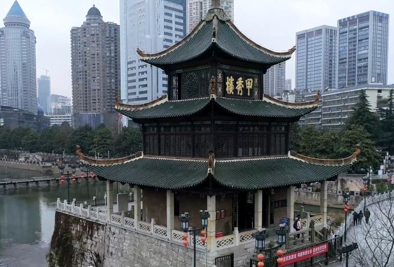 屹立在南明河上的甲秀樓,是繁鬧市區(qū)中不可多得的清幽之地,景區(qū)內古色古香,景區(qū)外高樓林立,在現(xiàn)代文明中閃爍著歷史的光芒,昂揚著“甲秀天下”的城市精神風貌。