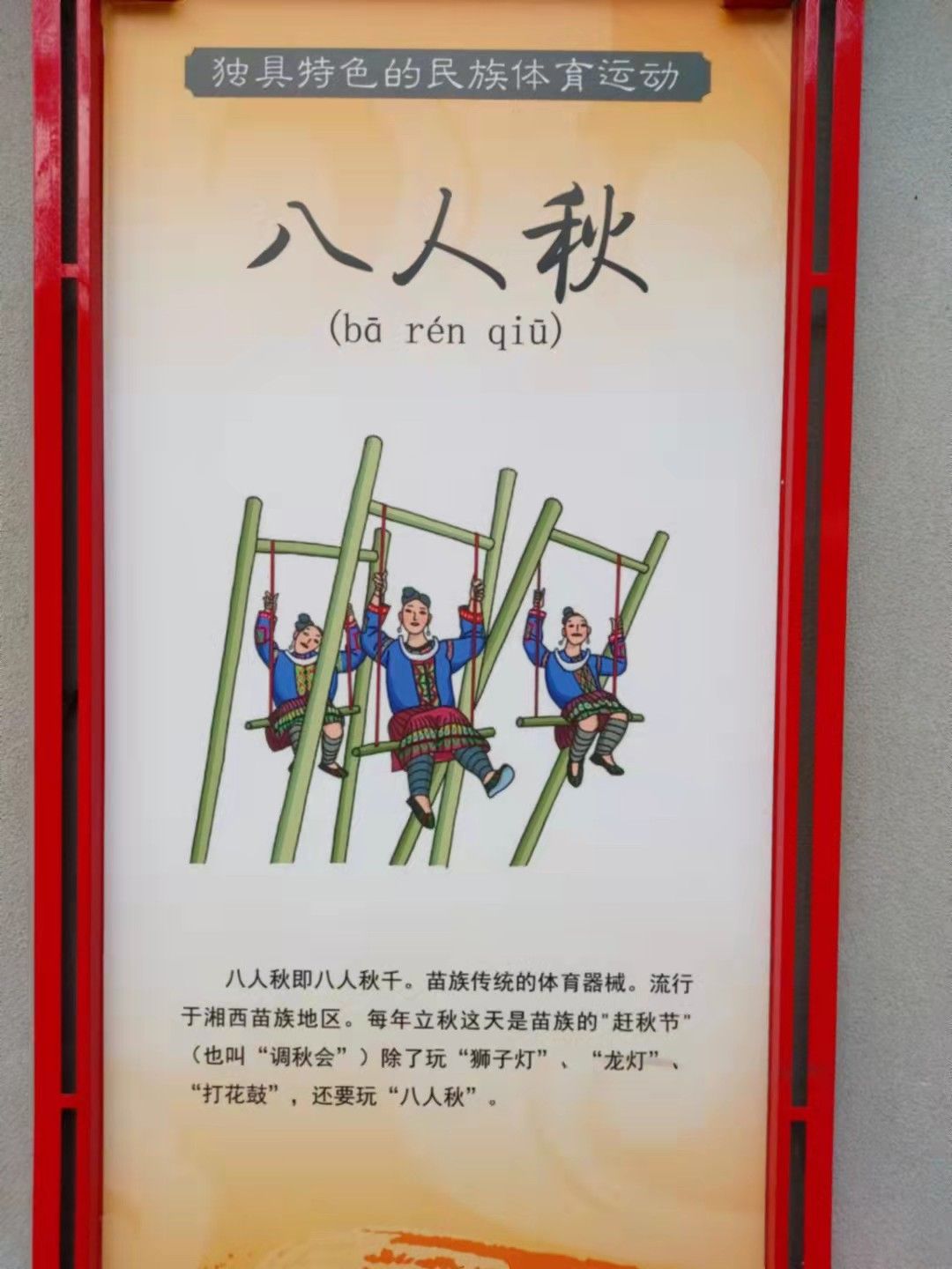 八人秋即八人秋千。苗族傳統(tǒng)的體育器械。流行于湘西苗族地區(qū)。每年立秋這天是苗族的“趕秋節(jié)”(也叫“調(diào)秋會(huì)”)除了玩“獅子燈”、“龍燈”“打花鼓”,還要玩“八人秋”。