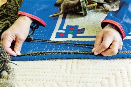 傳統(tǒng)氈繡不僅用于工藝品,大多用在生產(chǎn)生活中。蘇尼特氈繡技藝的繡制首先從制氈開(kāi)始,大都在夏末秋初進(jìn)行。材料多為駝絨線,而紡駝絨線則是用駱駝膝蓋絨毛以及駝鬣的細(xì)絨手搓而成。