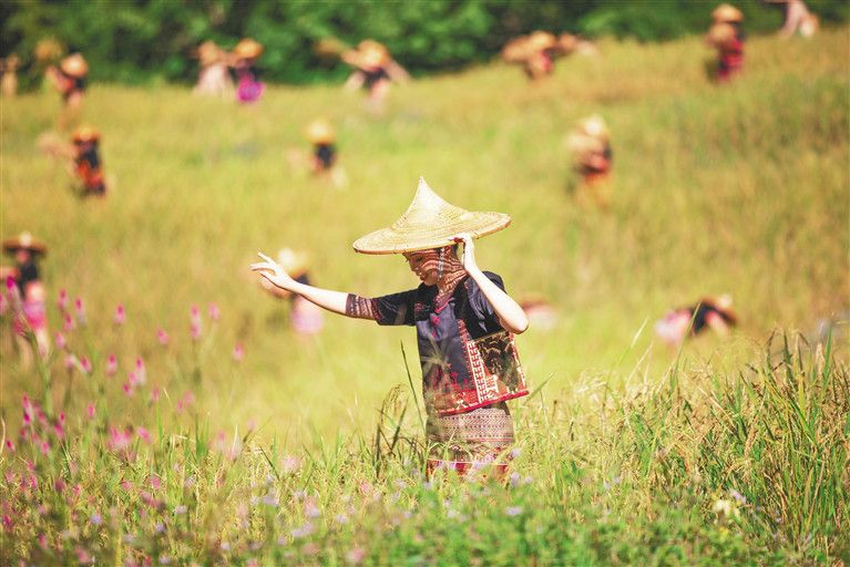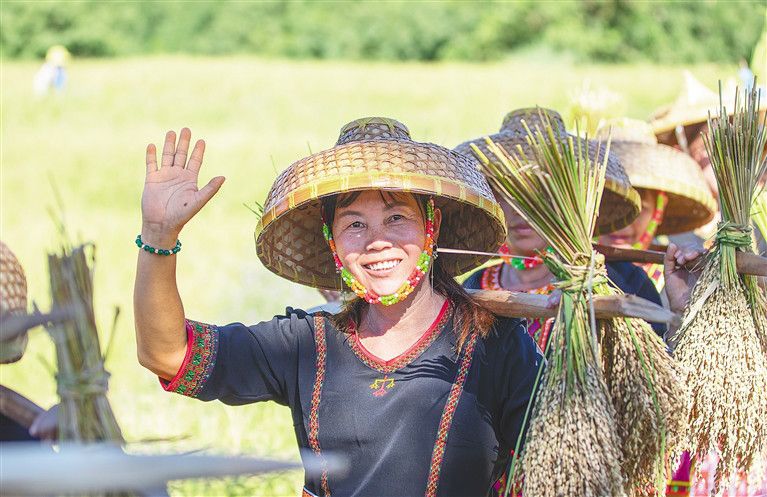 “砍山種植山蘭稻,一定要成功,煮好山蘭米,釀好山蘭酒,邀來(lái)親朋與好友,同慶好豐收……”當(dāng)天,在位于霸王嶺下的青松鄉(xiāng)擁處村的山坡上,一串串飽滿的稻穗已壓彎了稻稈;此時(shí),農(nóng)戶們?nèi)褰Y(jié)伴爬上山坡,弓下腰身麻利地?fù)]動(dòng)著手中的鉤刀開(kāi)割稻稈,在辛勤勞作之時(shí),還不忘哼起黎族歌謠分享著又是一年山蘭好收成的喜悅。山坡上辛勤勞作的喜悅,與正在山腳下舉辦的“啦奧門”山蘭文化節(jié)的喜慶氛圍達(dá)成了同一節(jié)拍。