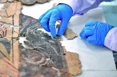在山西大同云岡石窟研究院壁畫文物修復(fù)室,工作人員在進(jìn)行壁畫修復(fù)。新華社發(fā)