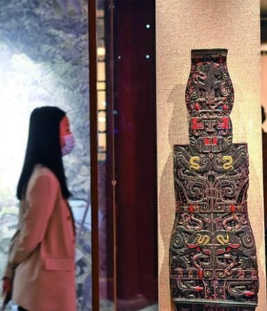 在位于北京的恭王府博物館內(nèi),觀眾在參觀展出的九連墩浮雕十弦琴。新華社發(fā)
