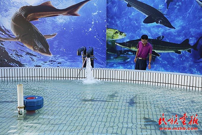 同江市赫哲族魚展館里養(yǎng)殖的鰉魚,這些鰉魚養(yǎng)大后會(huì)放歸自然。
