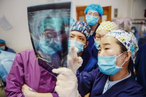 北京援藏醫(yī)生韓同英(右一)在北京市組團(tuán)幫扶的拉薩市人民醫(yī)院對當(dāng)?shù)蒯t(yī)生進(jìn)行傳幫帶。