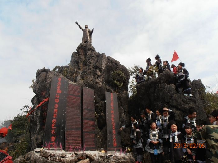 水族農(nóng)民起義抗清英雄潘新簡(jiǎn)的塑像在三都水族自治縣九阡鎮(zhèn)水梅村的岜碉山上矗立。