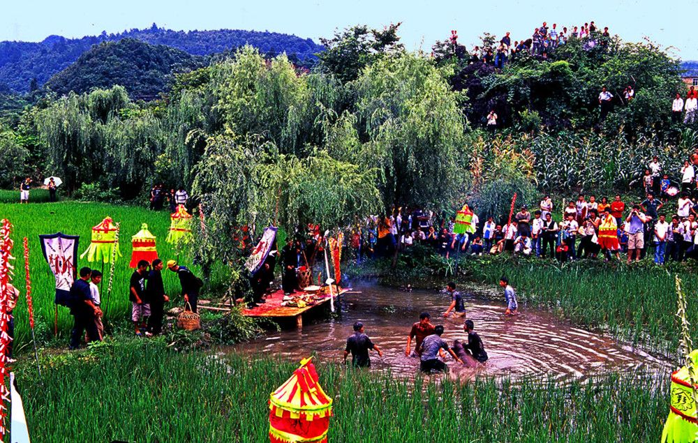 敬霞儀式在霞堂舉行。霞堂設(shè)有祭壇。壇前立著一根竹竿,竿頂上站立一只公雞。祭壇中是主祭席,其友有用松針?shù)伋墒€(gè)祭祀點(diǎn),由宗族各支系擺設(shè)祭品。敬霞這天,各支系由德高望眾者領(lǐng)隊(duì)。抬著豬肉、糯米飯、米酒等食品列隊(duì)進(jìn)入霞堂。一路上銅鼓、銅鑼、欽、革鼓被敲得冬嚏冬嚓地響,人們跟在后面吆喝著前進(jìn)。祭典開(kāi)始,鑼鼓暄天。接著由執(zhí)壇的水書先生念讀敬霞的祝詞,內(nèi)容多為祈福禳災(zāi),期冀風(fēng)調(diào)雨順,人壽年豐之類。祝詞之后便酪酒祭之:此后,由兩個(gè)身穿白衣的小伙子抬一母豬到田壩中繞行,后面那位不時(shí)用松針刺戳豬的尾部,使它發(fā)出嗥叫聲。圍觀的人常常發(fā)出哄笑,并且盡情地用竹片屏水和撮稀泥向抬豬者灑淋過(guò)去。走過(guò)霞堂之后,抬豬者丟下母豬,故意穿進(jìn)圍觀的人群,嚇得人們四處躲避。這種逗趣結(jié)束之后,水書先生再度念讀咒詞,當(dāng)他手中的執(zhí)法彩杖一揮時(shí),飼雞者便學(xué)雞嗚,逗引竹竿頂上的公雞啼鳴。這時(shí),主祭者就向眾人高呼:等待霞神降雨來(lái)沐浴。此后,水書先生再念祝詞,又酹酒祭之。然后由各族系代表抬著"酒壇去澆灌"霞神"。人們用酒從頭澆到腳,一直澆到"霞神"們倒(象征酒醉)才算祭祀的成功。
