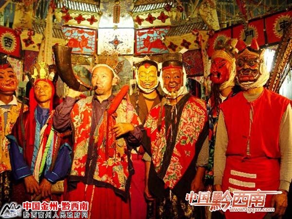 生活在黔西南州貞豐、晴隆、普安、望漠、冊亨、安龍、興義等8縣市的20萬苗族同胞的先民,在遠(yuǎn)古時代“信鬼不信神”,認(rèn)為人的靈魂不滅,祖先死后靈魂仍在,可以保佑子孫后代。因此,苗族先民往往祈求祖先,助其實現(xiàn)心愿,一但酬愿便要祭祀祖先,俗稱“還儺愿”。還愿時舉行的儀式就是儺儀。還儺愿主要由苗巫師主持,跳儺時配以唱、念及動作,儀式非常莊嚴(yán)肅穆。明末清初民間藝人開始將“還儺愿”的部分內(nèi)容整理、加工、完善后搬上舞臺,便成了儺戲。因此說,儺戲是從莊嚴(yán)的祭祖儀式脫胎而成的一種獨具特色的地方曲目。儺戲沒有管弦樂,但有節(jié)奏明快的鑼鼓伴奏,曲調(diào)流暢悅耳,劇情風(fēng)趣詼諧,更具有濃郁神秘的苗族文化色彩,深受苗族同胞的喜愛。
