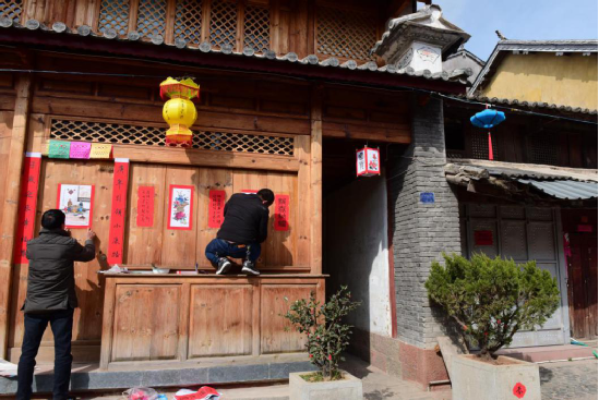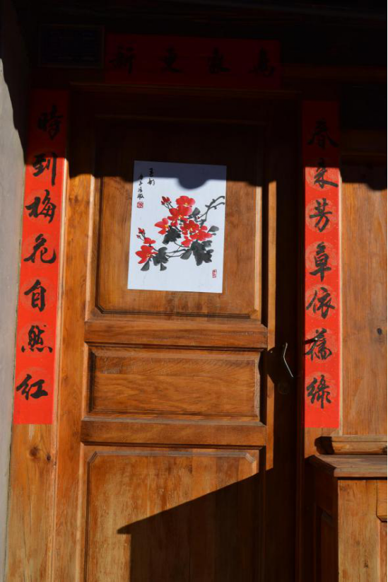 寫(xiě)春聯(lián)繪年畫(huà)的傳統(tǒng)在劍川縣金華鎮(zhèn)由來(lái)已久,明朝洪武年間改土歸流和移民屯邊制度的推行,使儒家文化、理學(xué)思想逐漸融入邊疆人民的生活。金華古鎮(zhèn)居民受此影響,走上追求仕途功名的道路,文人鄉(xiāng)紳都以顯示儒學(xué)身份為榮。每逢春節(jié),人們會(huì)邀請(qǐng)有功名的仕子或傳學(xué)明經(jīng)的文人來(lái)到家中,撰寫(xiě)對(duì)聯(lián),同時(shí)根據(jù)時(shí)令畫(huà)上一兩幅門(mén)神畫(huà),希望通過(guò)此舉祈愿自家后生求得功名。如今走在金華古鎮(zhèn)西門(mén)街上,仍能看到家家種花養(yǎng)草,戶戶楹聯(lián)盈門(mén),一派文風(fēng)蔚然的生機(jī)。