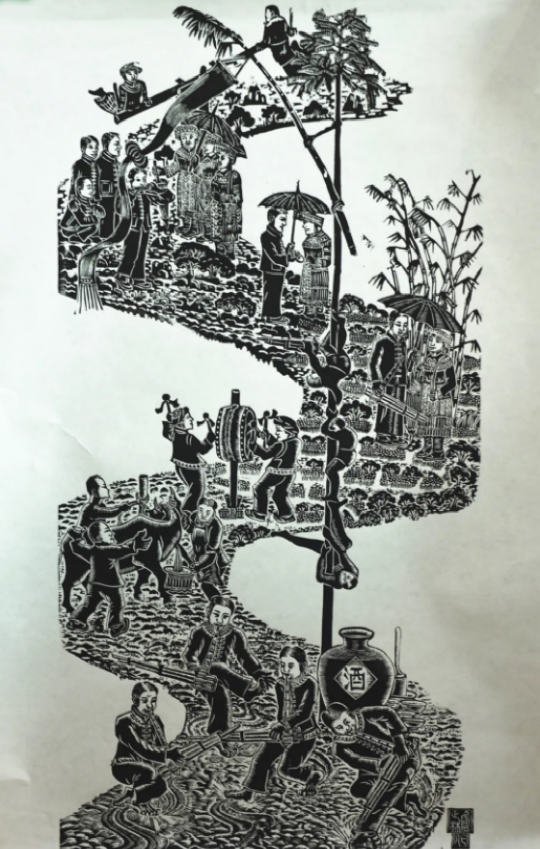 云南馬關(guān)壯族農(nóng)民版畫起源于馬關(guān)縣仁和鎮(zhèn)阿峨新寨村,“以刀代筆”是其主要的藝術(shù)形式,刀法粗獷、豪放而不乏細膩,具有濃郁的鄉(xiāng)土氣息和深厚的民族文化內(nèi)涵。