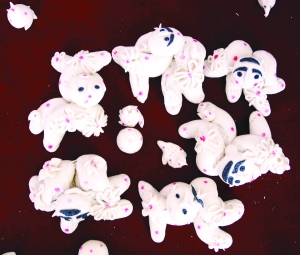 制面塑的工具比較簡單:有剪刀、菜刀、梳子、紅棗、花椒、紅豆等物。只要掌握好發(fā)面技術(shù),按照式樣進(jìn)行捏制,那么一個(gè)鮮活的面模形象就會(huì)脫穎而出。面塑的藝術(shù)的特點(diǎn)是“一印、二捏、三鑲、四滾”另外還有“文的胸、武的肚、老人的背脊、美女的腰”。