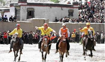 藏歷4月10日到28日,是江孜傳統(tǒng)的節(jié)日—達(dá)瑪節(jié),藏語(yǔ)意為跑馬射箭。據(jù)傳說(shuō)江孜法王繞丹貢桑帕巴桑布,是薩迦王朝的內(nèi)務(wù)大臣,又是江孜法王,在群眾中頗有威望。帕巴白去世后,他的弟子每年做祭祀,以示紀(jì)念。后因戰(zhàn)亂,祭祀中斷。至藏歷火鼠年(公元1408年)繞丹貢桑帕任江孜法王,遵其父貢桑帕的遺囑,恢復(fù)祭祀。這一年藏歷4月10日至4月27日,繞丹貢桑帕為其祖父念經(jīng)祭祀,直到28日,開(kāi)始進(jìn)行娛樂(lè)活動(dòng)。內(nèi)容主要是曬唐卡畫、宗教文藝活動(dòng)等。除此之外,還有角力、跑馬、拋石頭等娛樂(lè)活動(dòng)。這些活動(dòng),全由法王的部下、兵丁、傭人承辦。從這年開(kāi)始,固定這段時(shí)間為每年一度的祭祀盛典節(jié)日。到了扎西繞丹帕(公元1447年)統(tǒng)轄江孜的時(shí)候,娛樂(lè)活動(dòng)更為豐富,除上述內(nèi)容外,還增加了跑馬射箭。于是流行為盛大的江孜達(dá)瑪節(jié)。